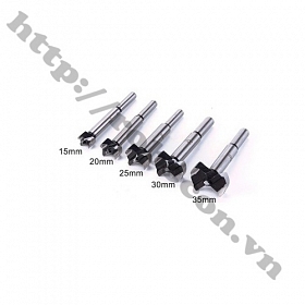 Trọn bộ gồm 5 mũi có các kích thước 15, 20, 25, 30, 35mm. Cốt trục mũi phay 8 - 10mm.