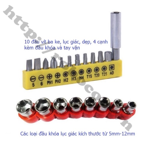 Bộ dụng cụ sửa chữa đa năng 20 món được thiết kế đầy với 10 đầu vít đủ loại kích cỡ khác nhau (vít ba ke, lục giác, dẹp, 4 cạnh) và 8 loại đầu khóa lục giác với các kích thước phổ biến sẽ là công cụ hữu hiệu trong bộ dụng cụ sửa chữa của gia đình bạn.