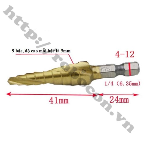 Mũi Khoan Bước-Tháp Xoắn Chuôi Lục Giác 4-12mm phục vụ phần lớn các nhu cầu khoan thông thường là gồm các mũi từ 4 đến 12 mm.  Thay vì phải mang theo 5 mũi khoan với các đường kính khác nhau ta chỉ cần một mũi khoan bước 4 đến 12mm là đủ.