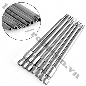 - Bộ 7 mũi lục giác hoa thị có lỗ cho máy khoan và bắt vít: 7 đầu tiện lợi : T8 - T10 - T15 - T20 - T25 - T27 - T30 dài 75mm.