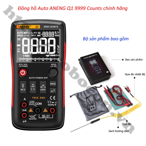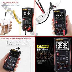 - Đồng hồ Auto kỹ thuật số ANENG Q1 True RMS ngoài các chức năng đo cơ bản như đo chính xác điện áp AC/DC, dòng điện AC/DC, điện trở, tần số, kiểm tra diode, kiểm tra tính liên tục… còn có khả năng đo nhiệt độ, độ ẩm và đặc biệt có thể đo nhiệt độ của dung dịch hoặc jelly với độ chính xác trên 99% gần như tuyệt đối.