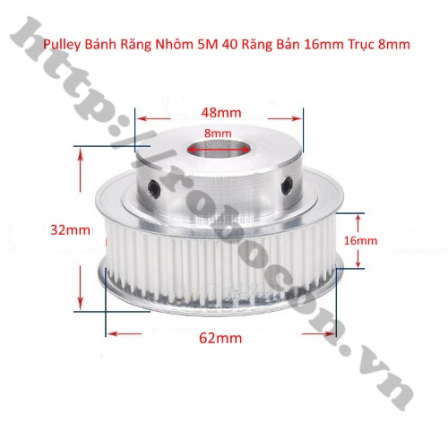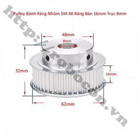 Pulley bánh răng nhôm 40 răng-5M- trục 8mm đường kính 62mm sử dụng rộng rãi trong máy công cụ, dệt vải gia đình, in ấn, bao bì thực phẩm, dây và cáp điện, thiết bị đo đạc, hóa dầu, viễn thông và các ngành công nghiệp khác trong cơ cấu ổ đĩa vành đai