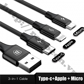 Dây cáp BASEUS Rapid Series 3 trong 1 với thiết kế 3 trong 1 tiện dụng, vừa có thể sử dụng cho cổng Micro USB, cổng Type-C của các dòng điện thoại từ SamSung, HTC, Sony, cũng như là cổng Lightning cho các sản phẩm của Apple…Cũng như rất phù hợp với nhu cầu sử dụng cho pin dự phòng.
