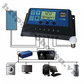 - Bộ Điều Khiển Sạc Năng Lượng Mặt Trời Hiển Thị LCD 30A 12V/24V là bộ điều khiển tự động quản lý hoạt động của pin mặt trời, thường được thợ sử dụng để thay thế, lắp đặt và sửa chữa hệ thống pin năng lượng mặt trời. Bộ điều khiển dễ dàng thiết lập và vận hành. Để bảo vệ tuổi thọ của ắc quy, khi điện áp của ắc quy giảm xuống dưới 10.5V, bộ điều khiển năng lượng mặt trời sẽ tắt tự động.