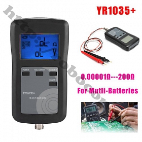 - Máy đo nội trở, điện áp pin YR1035+ được sử dụng để đo pin trong quá trình đóng pin, cân bằng pin, ắc quy axít chì, lithium ion, lithium polymer, pin sắt phosphate, kiềm, pin khô, niken hydro, nickel cadmium, pin cúc áo... Máy đo nội trở có 2 dây phạm vi đo 0.00001Ω --- 200Ω.