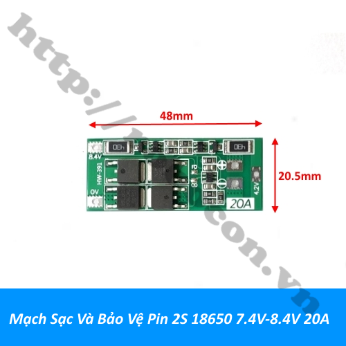 - Mạch sạc và bảo vệ pin 2S 7.4V-8.4V 20A là 1 bảng mạch sạc pin lithium, pin li-ion, 2S được sử dụng để sạc 2 cell pin 18650, pin 26650 mắc nối tiếp và bảo vệ pin chống quá tải khi sử dụng chạy tải, mạch có chức năng sạc riêng rẽ cho từng cell (balance charging), ngắt khi đầy, bảo vệ chập nguồn, quá áp và pin dưới áp quy định.