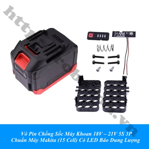 - Vỏ pin chống sốc máy khoan 18v – 21v 5s 3p chuẩn máy (15 cell) có led báo dung lượng dùng để DIY dành cho máy khoan pin, máy mài, máy cắt, cầm tay và tất cả các máy dòng , bê tông 18v, vỏ 2 hàng, đựng được tối đa 10 cell pin lion, sử dụng mạch bảo vệ 5S hoặc mạch bảo vệ 5S 18v.