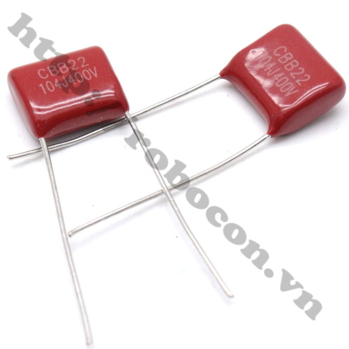 - Tụ điện CBB22 400V 104J là tụ điện có điện môi được chế tạo theo công nghệ Polypropylene Film, 2 chân cắm của linh kiện được mạ thiếc.