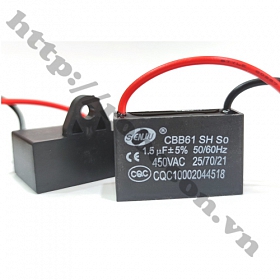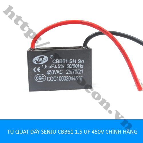 - Tụ quạt dây SENJU CBB61 SH SO 1.5 uf 450V chính hãng được dùng kích dòng khởi động trong các loại quạt điện và làm việc tốt hơn các động cơ trong hệ thống cung cấp điện xoay chiều tần số 50Hz / 60Hz.