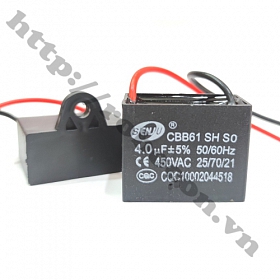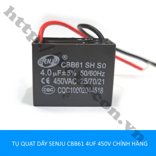 - Tụ quạt dây SENJU CBB61 SH SO 4uf 450V chính hãng được dùng kích dòng khởi động trong các loại quạt điện và làm việc tốt hơn các động cơ trong hệ thống cung cấp điện xoay chiều tần số 50Hz / 60Hz.