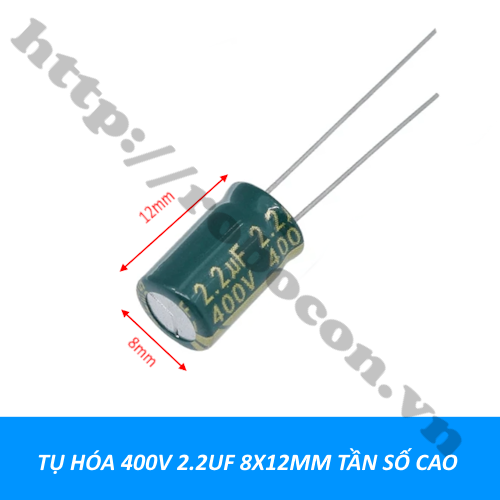 - Tụ hóa 400V 2.2uF 8x12mm tần số cao nichicon (còn được gọi là capxon) là tụ phân cực, có dung môi là một lớp hóa chất. Tụ hóa 400V 2.2uF 8x12mm là tụ có hình trụ, trị số được ghi trực tiếp trên thân tụ. Tụ điện là một linh kiện thụ động xuất hiện hầu hết trong các mạch điện tử.