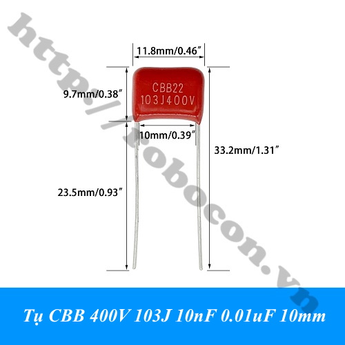 - Tụ CBB 400V 103J 10nF 0.01uF 10mm là tụ điện có điện môi được chế tạo theo công nghệ Polypropylene Film, 2 chân cắm của linh kiện được mạ thiếc.