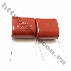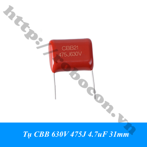 - Tụ điện Tụ CBB 630V 475J 4.7uF 31mm là tụ điện có điện môi được chế tạo theo công nghệ Polypropylene Film, 2 chân cắm của linh kiện được mạ thiếc.