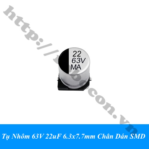 - Tụ Nhôm 63V 22uF 6.3x7.7mm Chân Dán SMD là một loại tụ hóa có anode (+) bằng lá nhôm, với bề mặt được oxy hóa làm lớp điện môi mỏng, và chất điện phân được phủ lên lớp oxyt làm cathode