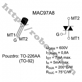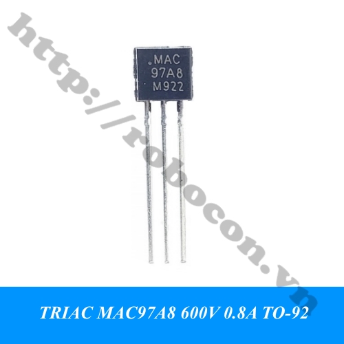 - Triac MAC 97A8 là một linh kiện bán dẫn làm việc như 2 Thyristor mắc song song ngược chiều, có thể dẫn điện theo hai chiều. Triac MAC97A8 được đóng gói theo chuẩn TO-92, gồm 3 chân.
